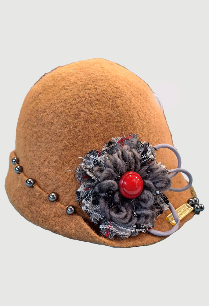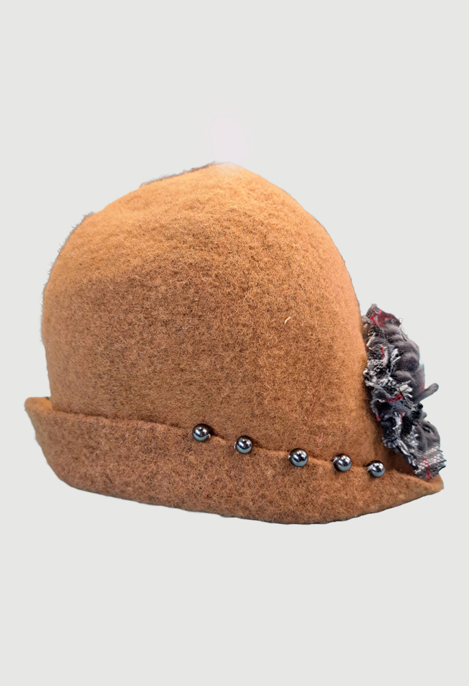 Wool hat decorated with a fabric flower, threads, and pearls. A wonderful accessory for winter, keeping us warm, elegant, and stylish.