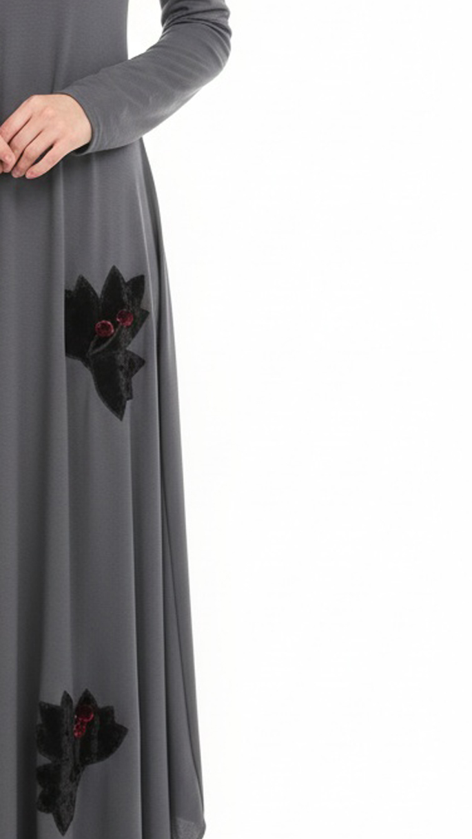 Φόρεμα γκρι, ελαστικό, διακοσμημένο με πλατανόφυλλα από βελούδο. Υπέροχο ένδυμα για τις απογευματινές και βραδινές μας εξόδους, αλλά και για τις πιο σημαντικές στιγμές της ζωής μας.