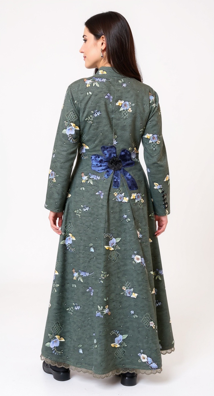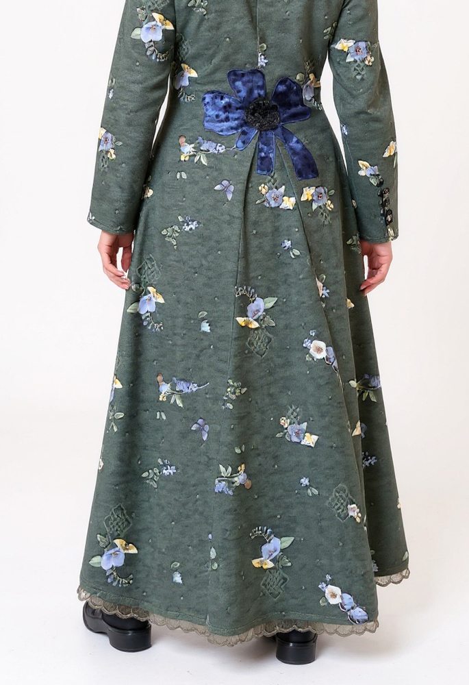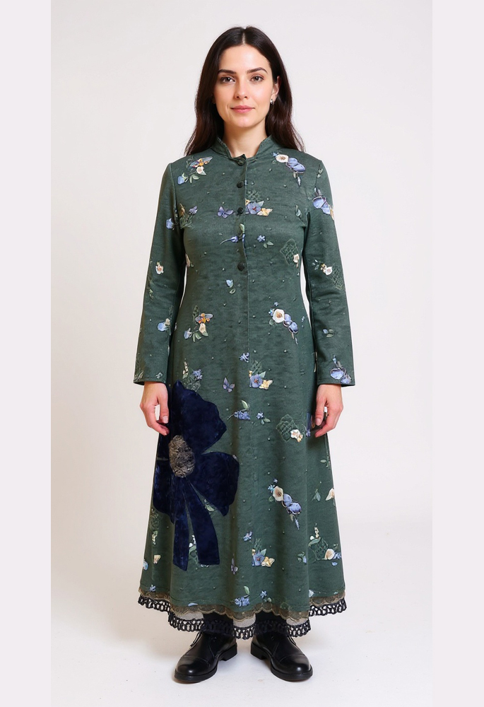 Φόρεμα εμπριμέ, floral σε άλφα γραμμή, με κουμπιά ντυμένα από το ίδιο ύφασμα, διακοσμημένο με μπλε βελούδινα λουλούδια patches και δαντέλα στο τελείωμα. Υπέροχο ένδυμα για τις πρωινές και απογευματινές μας βόλτες, αλλά και για χαλαρές βραδινές εξόδους. Κατάλληλο για γυναίκες που έχουν έντονο το ρομαντικό στοιχείο στην ζωή τους και με το συγκεκριμένο ρούχο θα το απογειώσουν.