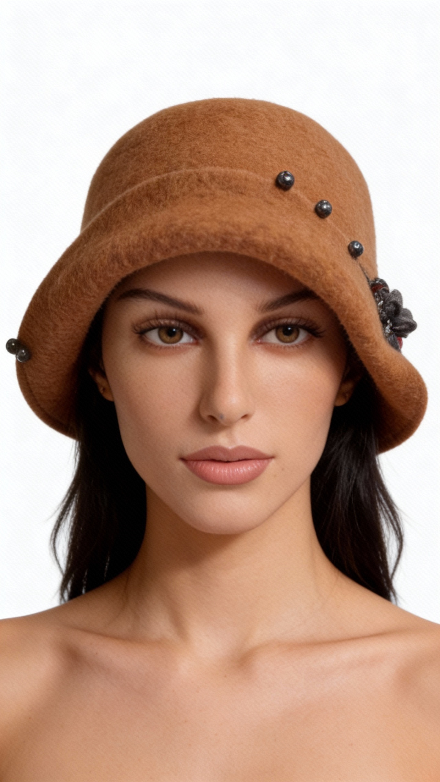 Καπέλο μάλλινο, διακοσμημένο με γκρι λουλούδι και πέρλες. Υπέροχο αξεσουάρ για γυναίκες που αγαπούν το στυλ μια περασμένης εποχής. Κατάλληλο να φορεθεί από το πρωί έως το βράδυ. Ιδανικό για τις κρύες ημέρες του χειμώνα.