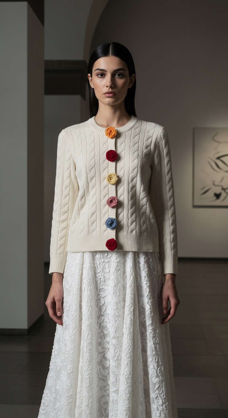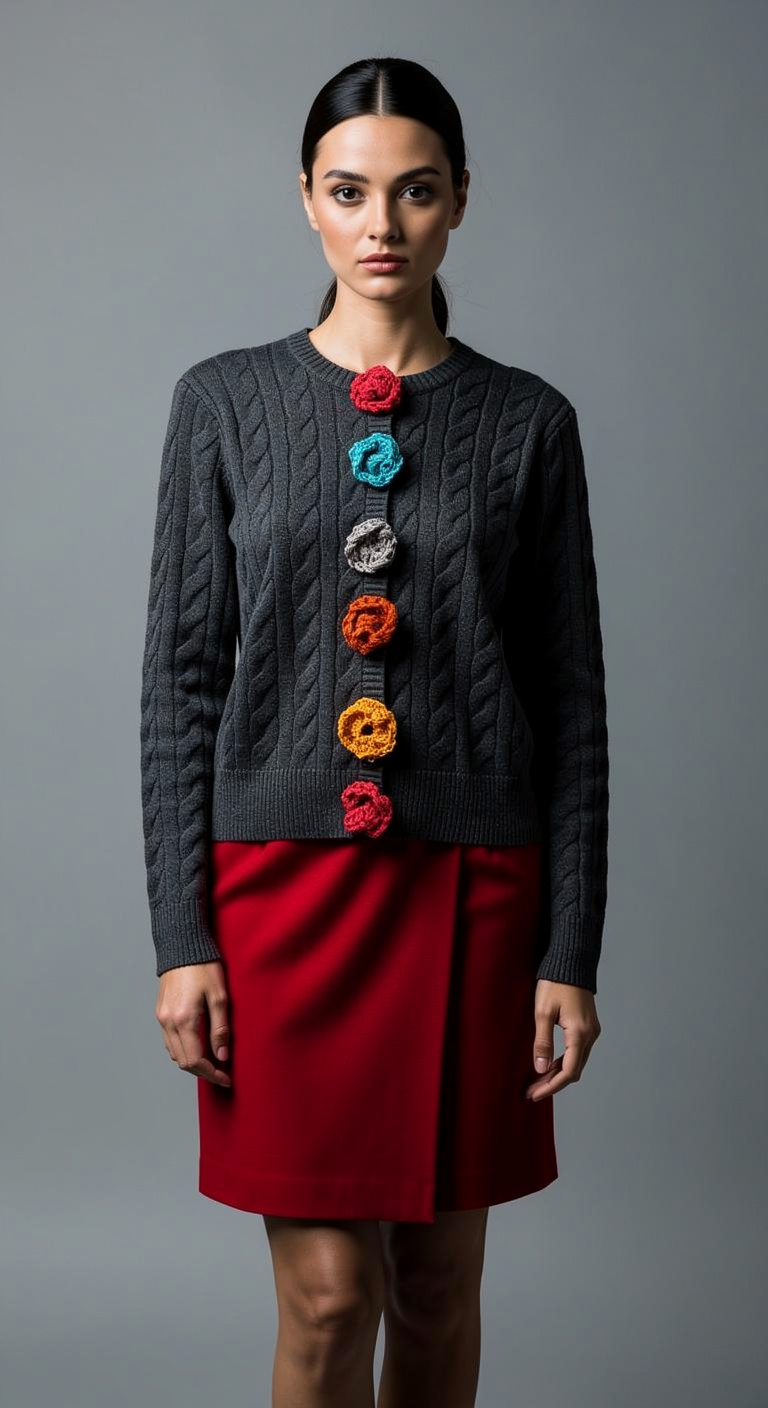 Ζακέτα viscose, διακοσμημένη με χειροποίητα λουλούδια πλεκτά. Ιδανικό ένδυμα για όλες τις ώρες της ημέρας. Για γυναίκες με έντονο ρομαντισμό κι εναλλακτικό στυλ.